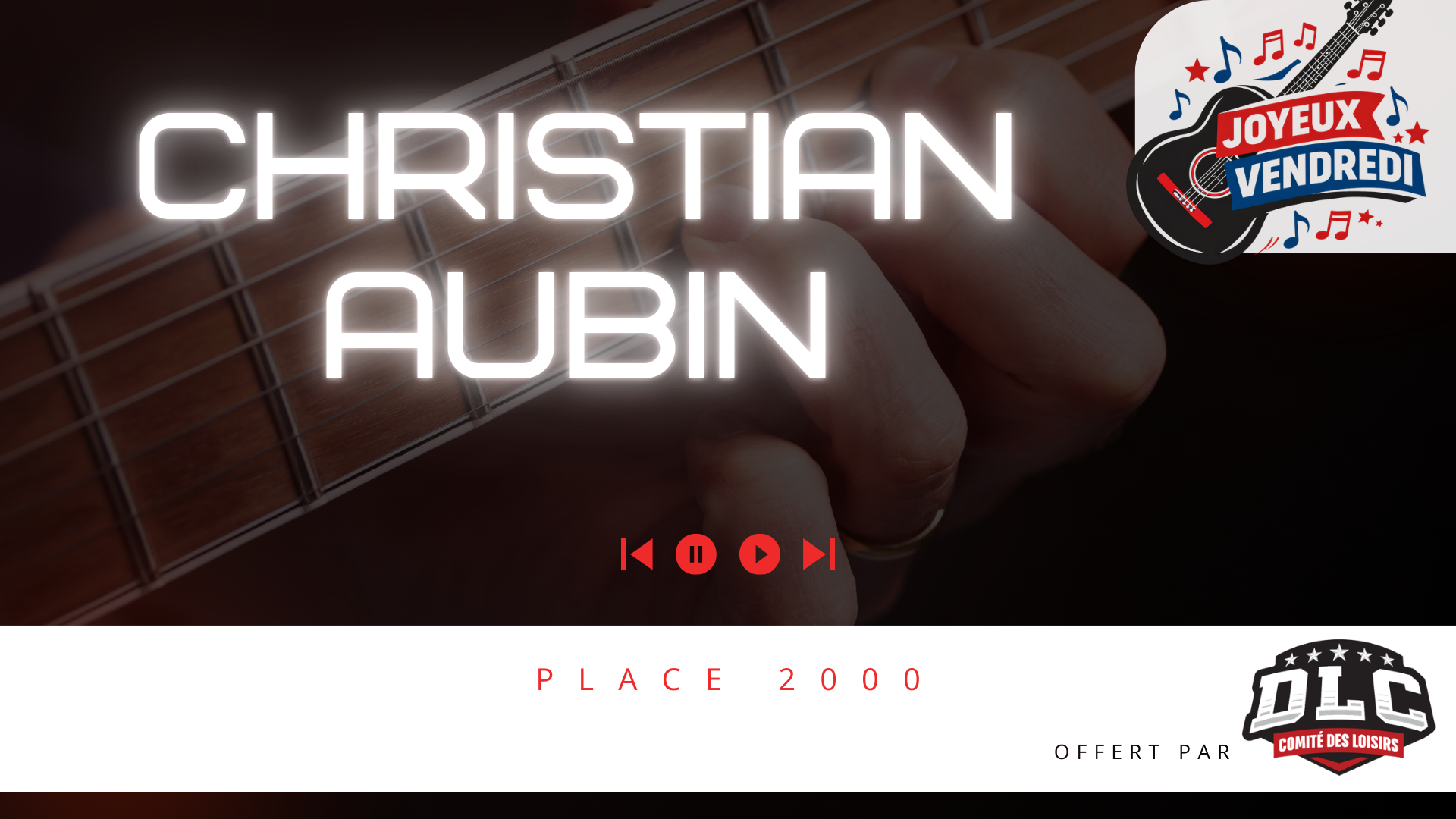 📅 Date : vendredi 24 juillet 2026 ⏰ Horaire : Dès 20 h : Ouverture de la salle 21 h 00 : Début du spectacle (band) 📍 Lieu : Place 2000 🎁 Activité offerte par le Comité des Loisirs DLC |