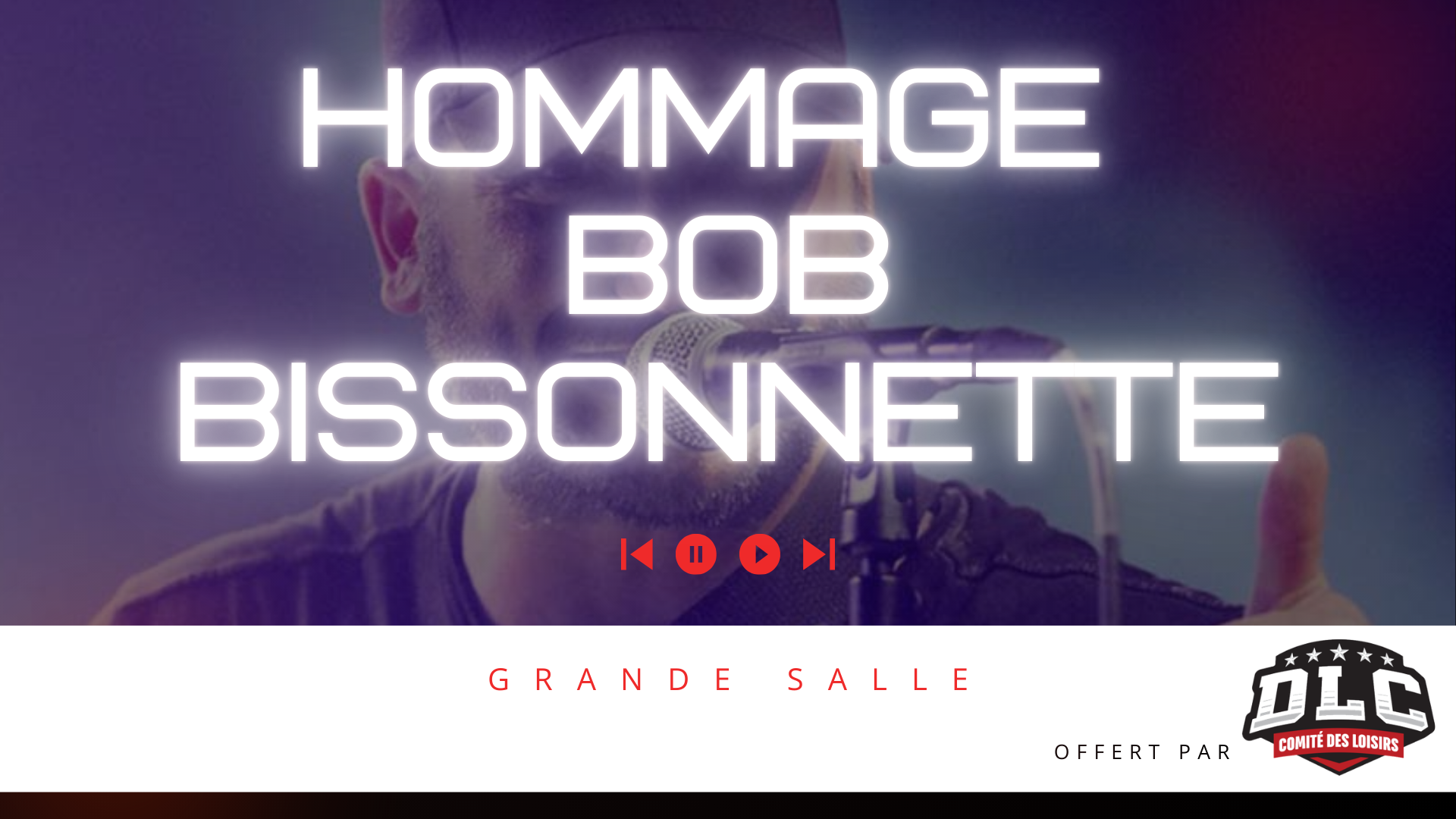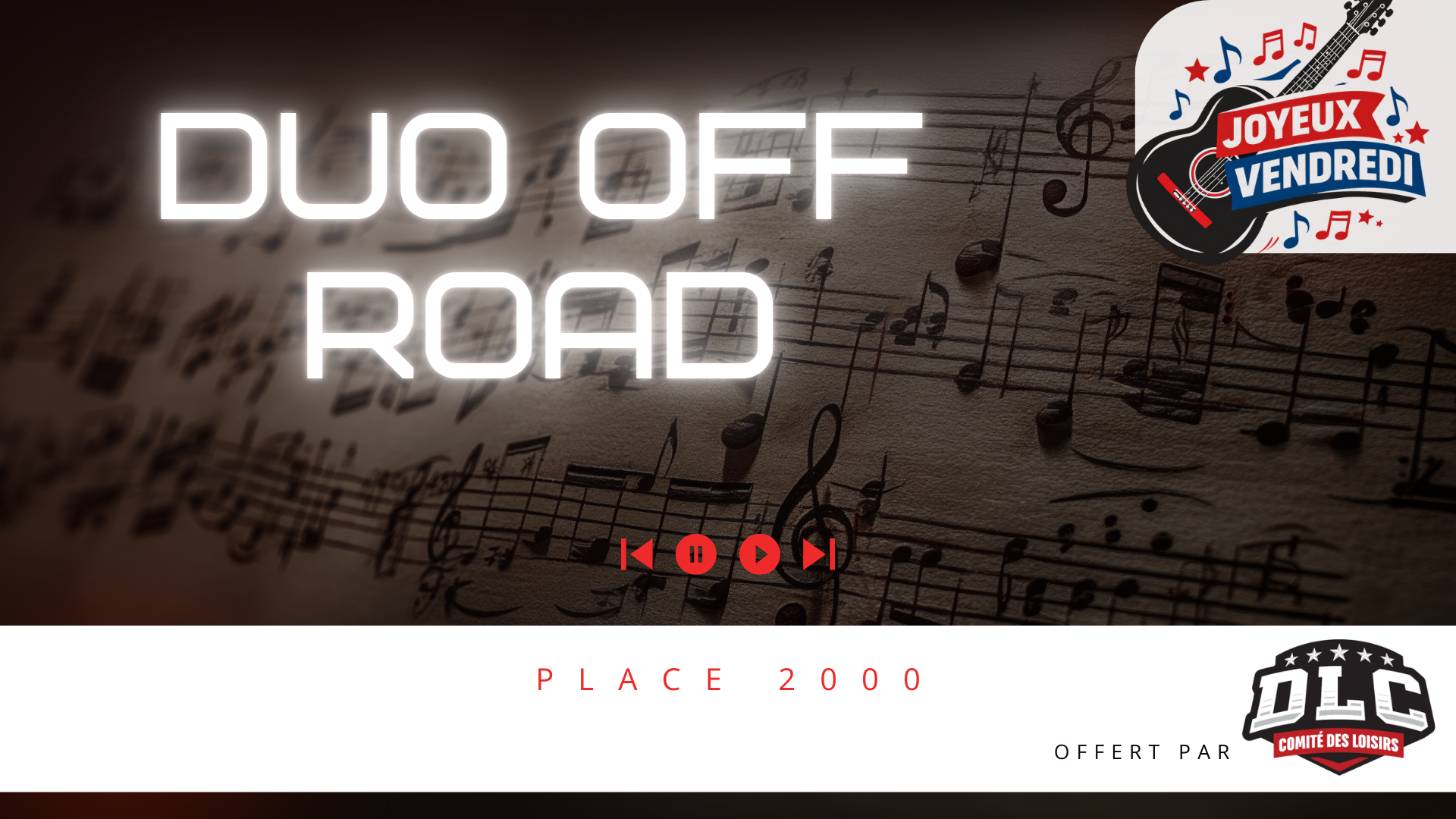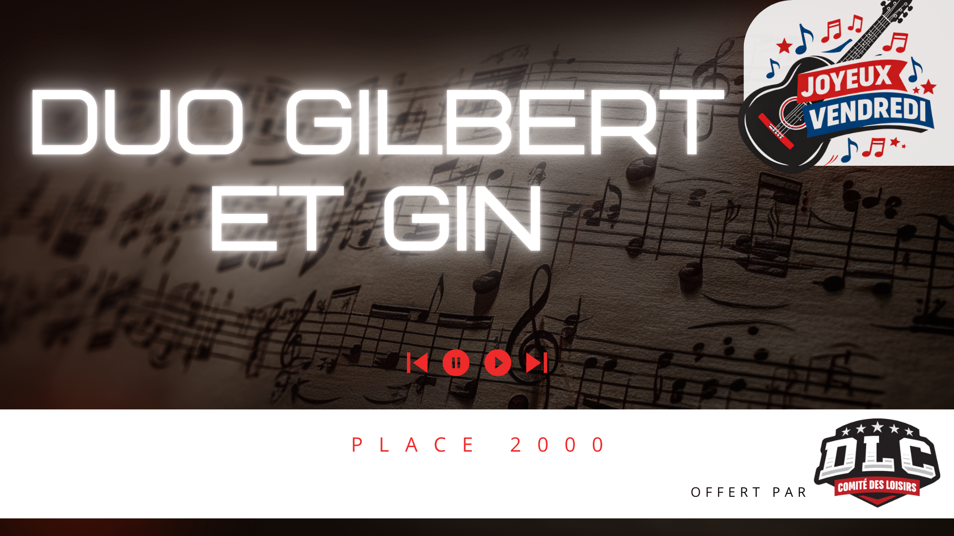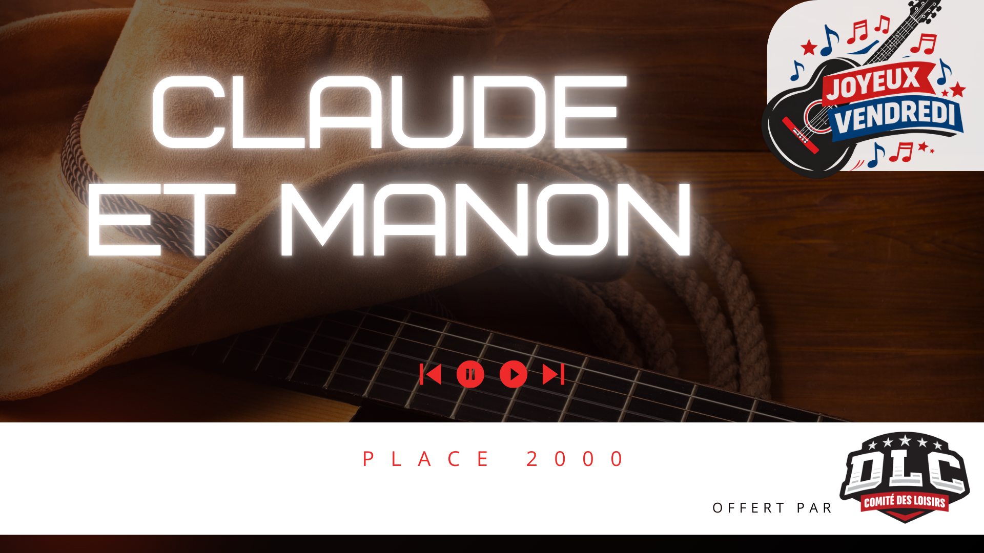 📅 Date : vendredi 10 juillet 2026 ⏰ Horaire : Dès 20 h : Ouverture de la salle 21 h 00 : Début du spectacle (band) 📍 Lieu : Place 2000 🎁 Activité offerte par le Comité des Loisirs DLC |